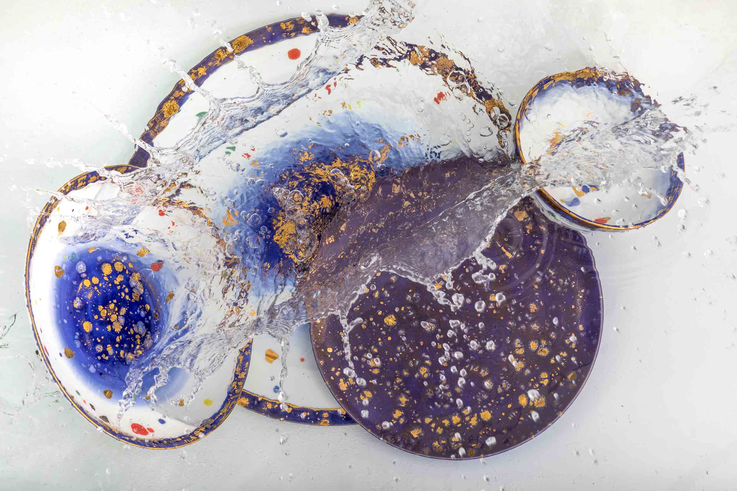 Handcrafted in Italy with the finest porcelain, the Apollo Bianco line transports us to a fairy-tale and oriental world. While the center is dotted with multicolored points, the shades of lapis lazuli blue evoke the magic of Eastern tales. A fairy tale unfolds with small playful nuggets of gold, green, red, and blue that float in the bright sky surrounded by a precious golden halo and a blue border. Soup and dessert plates are also available with a rich dark blue decoration interspersed with golden dots.