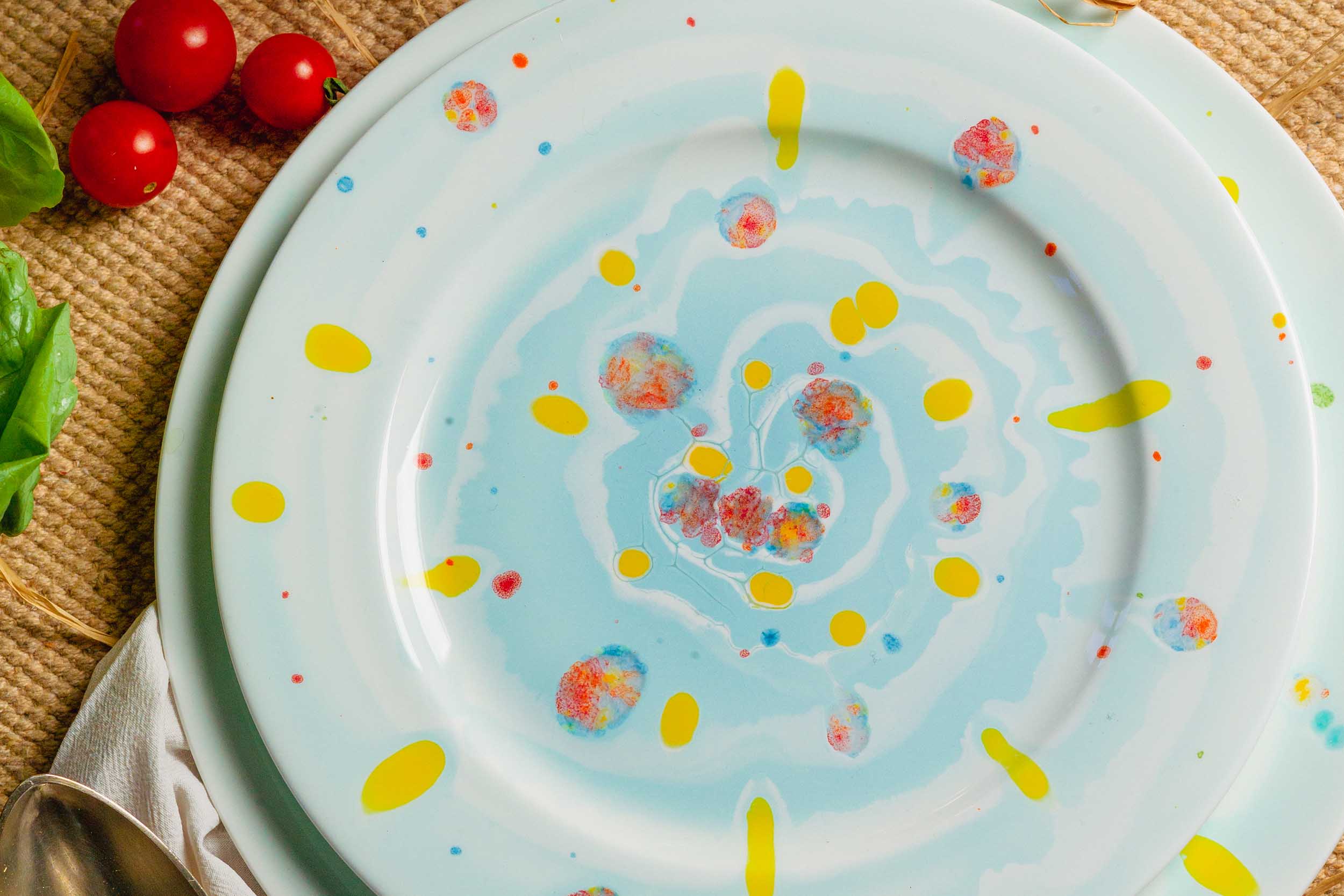 Shades of light blue surrounding dynamic blue spirals starting from the center drag in their vortex bright yellow spots that recall the clear summer light. The dinner plate comes in alternative in a bright yellow enamel and a light blue center with multicolor splotches.