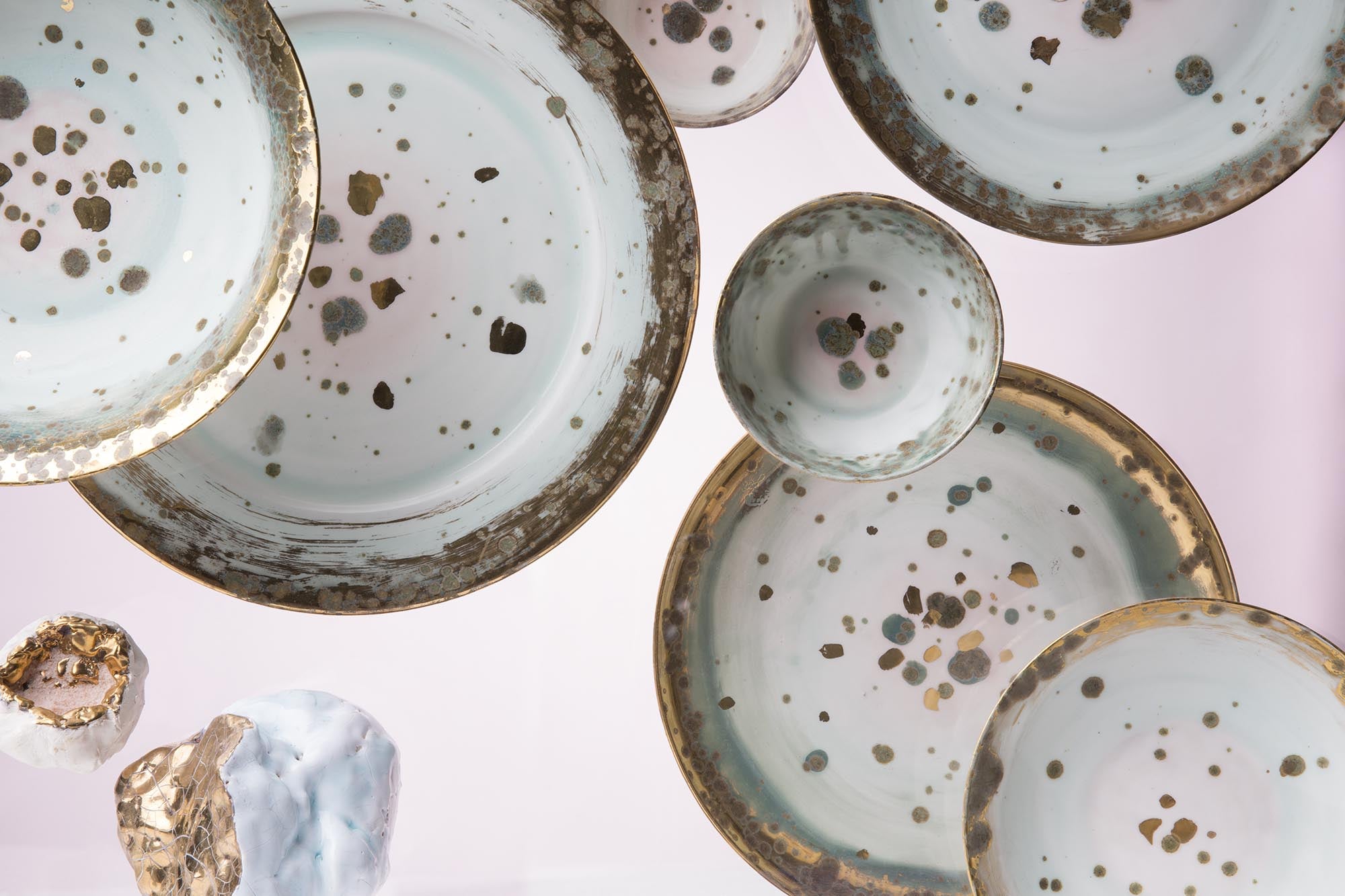 Material and earthy, like the great Renaissance Master’s work, it conveys classical beauty and elegance thanks to green shades with a light pink center, golden and green punctuation and broad golden rims. Golden and green dots and spots float like leaves on a romantic pond. The rim is surrounded by a large golden decoration.The soup and dessert plates are offered also with a full green and gold décor.