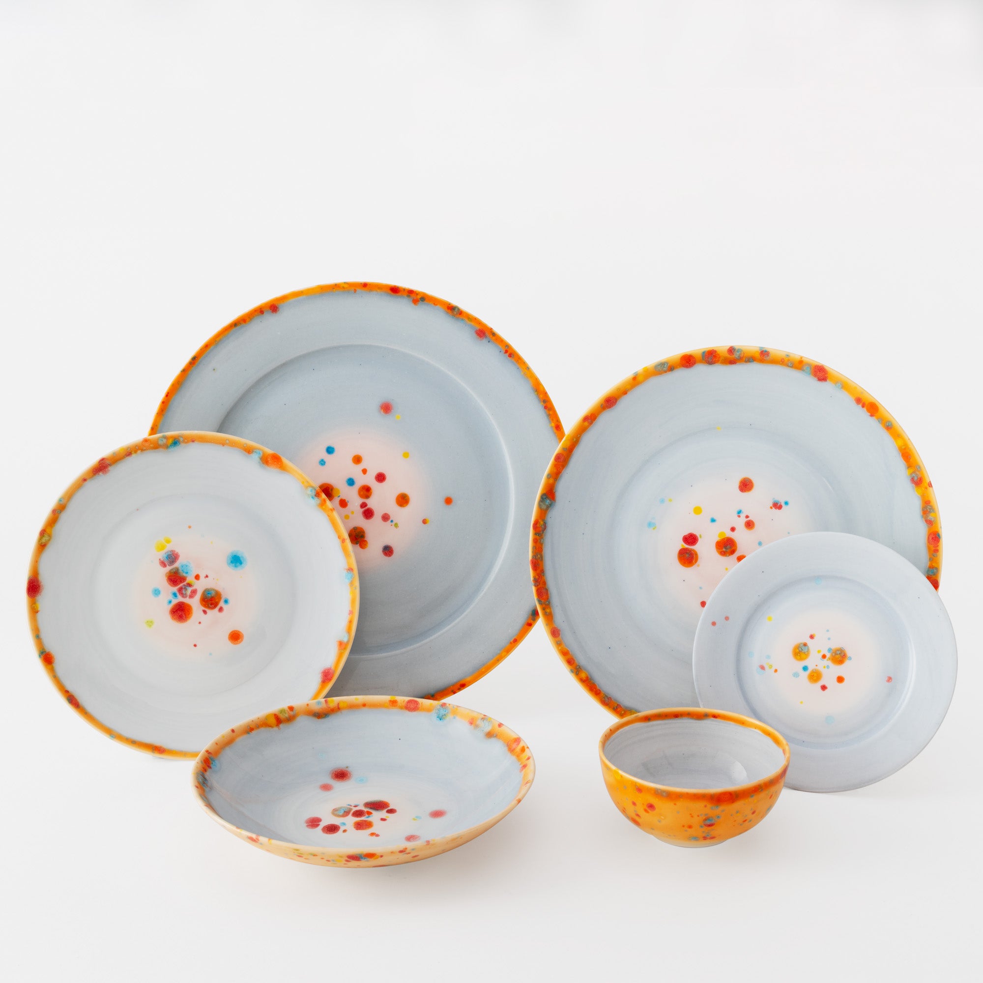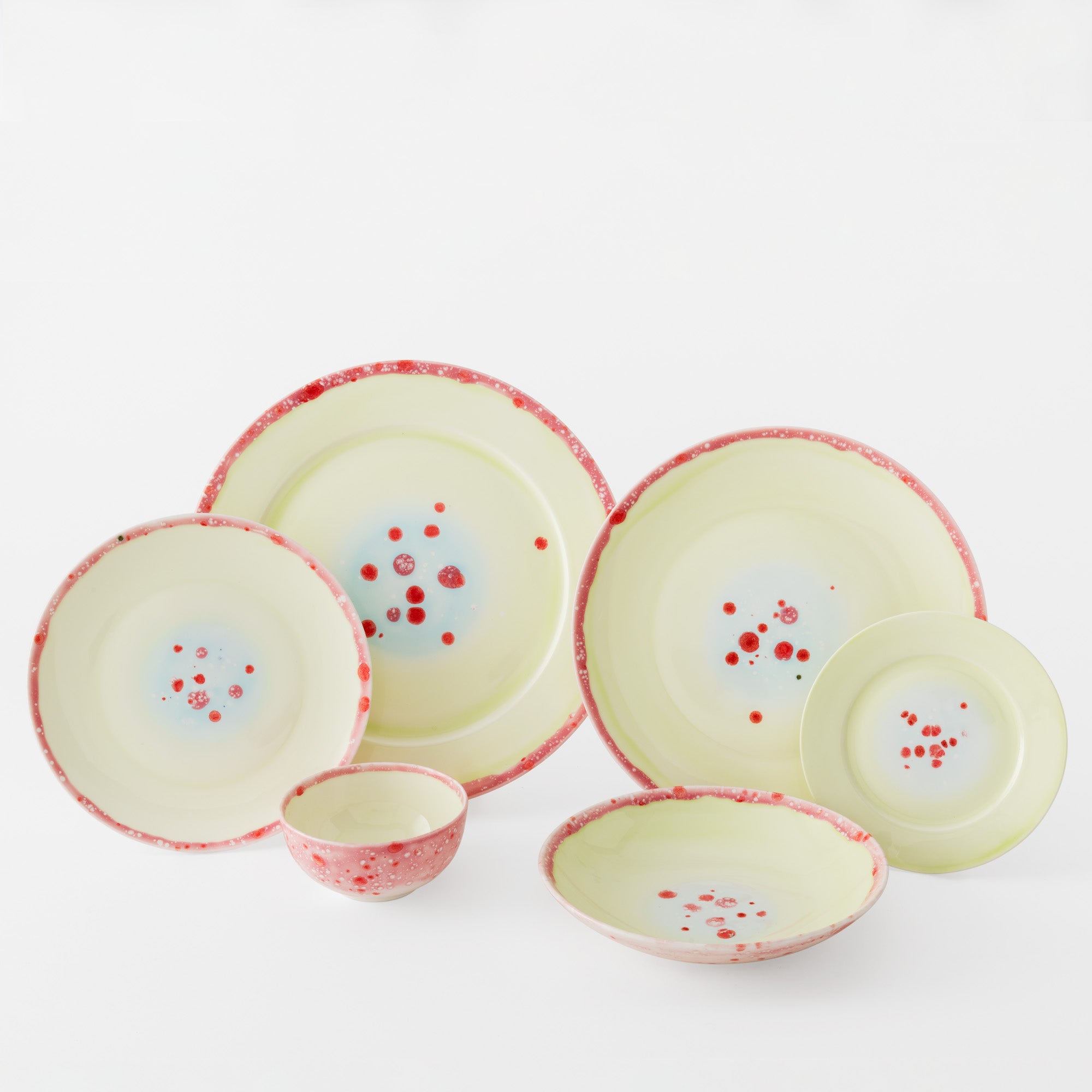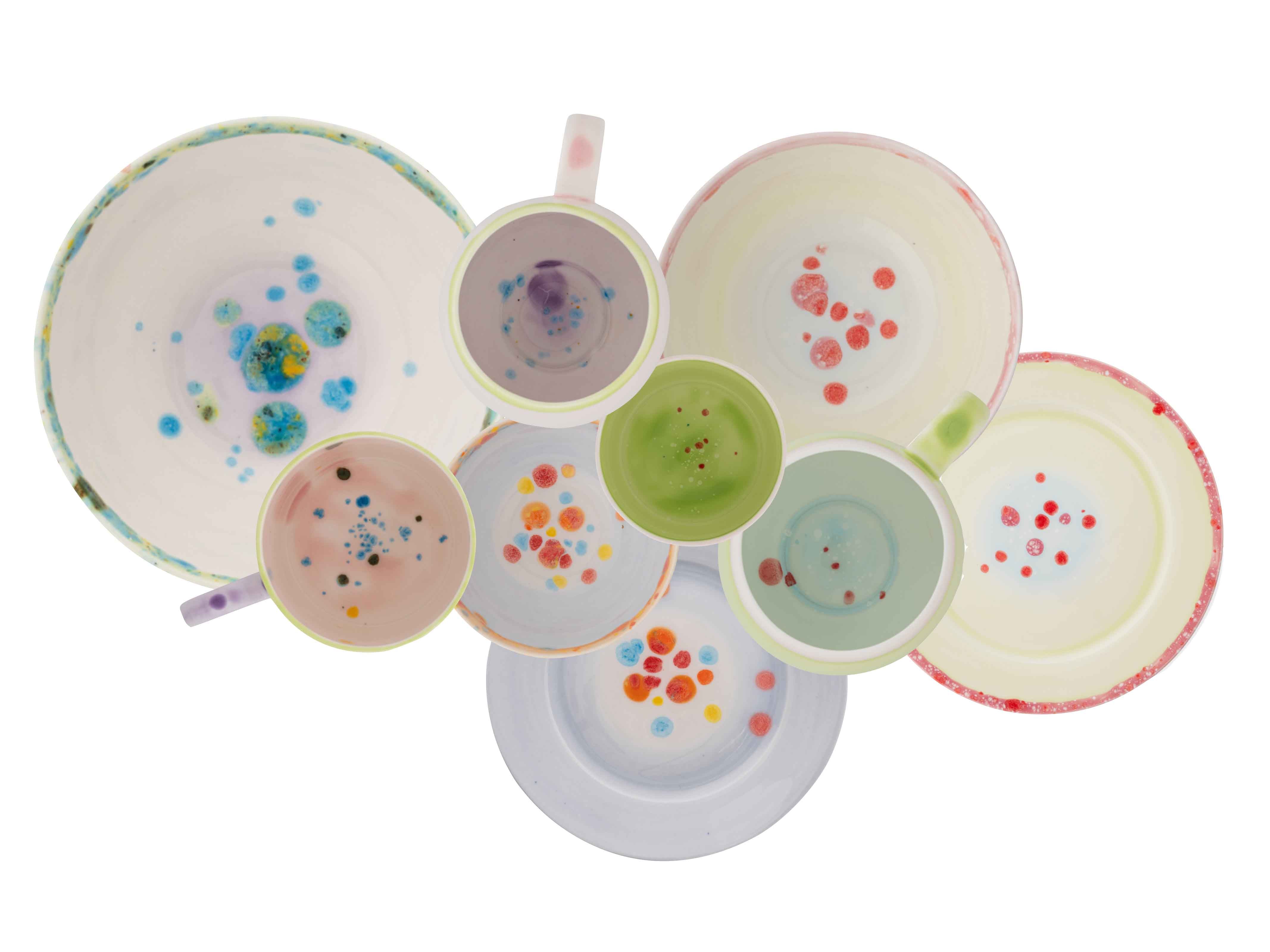 The inspiration for this collection derives from the celebrated Venetian glasses, small circular spheres full of colors, like intricate kaleidoscopes.On the edges of her plates, Coralla’s Murrine open up and break down, dispersing crystals like colored flower seeds. This collection is made up of four predominant colours: Yellow, Green, Lilac and Grey. They give an impression of joy, lightness and harmony, an impression enhanced by mixing the colors on the table.