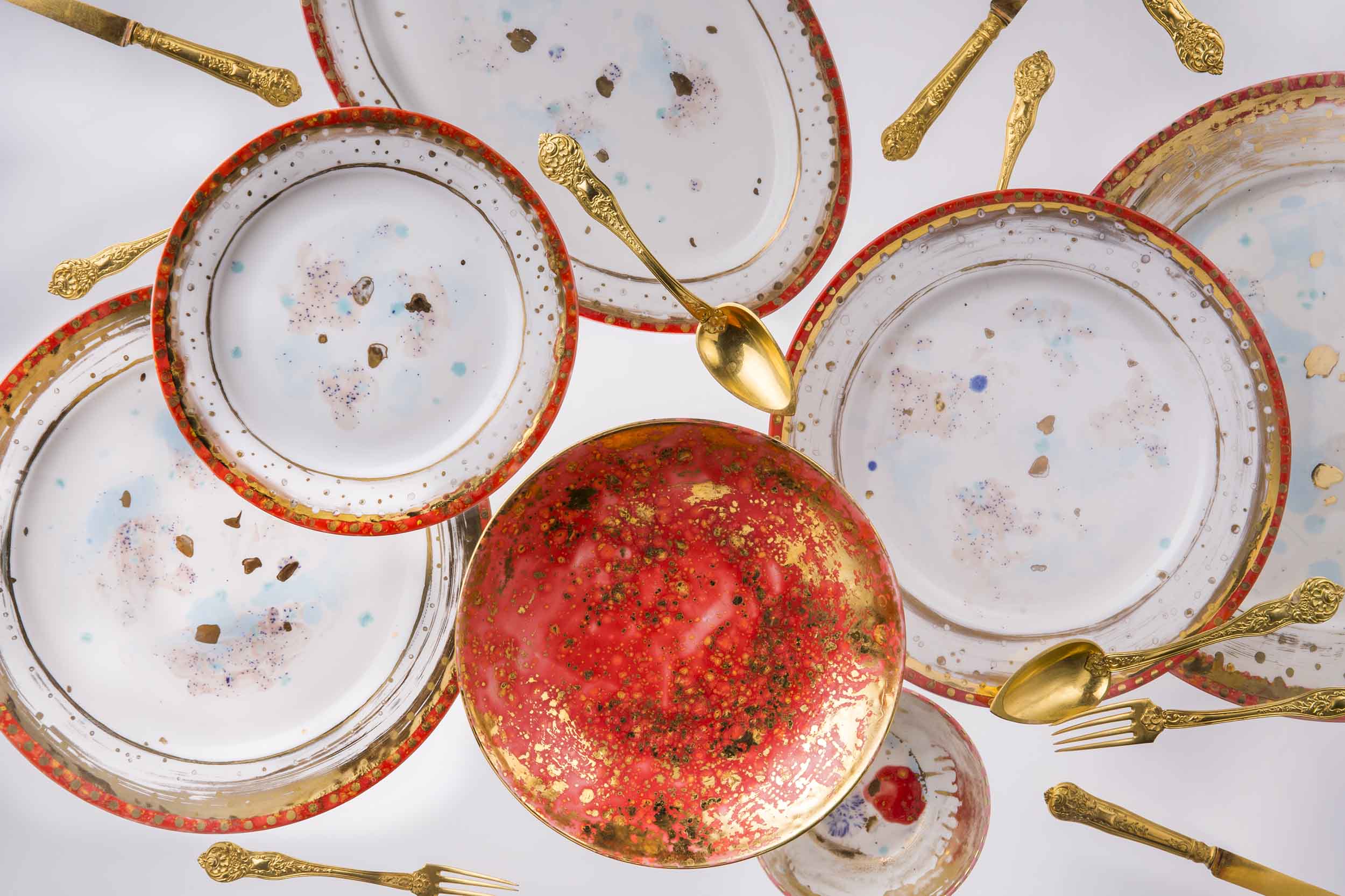 A brilliant border in African red, surrounded by golden decoration; in the center, very delicate spots of pink and light blue with splashes of golden nuggets. Soup and dessert plates are also available with a complete red and gold decoration in which red and gold blend finely.