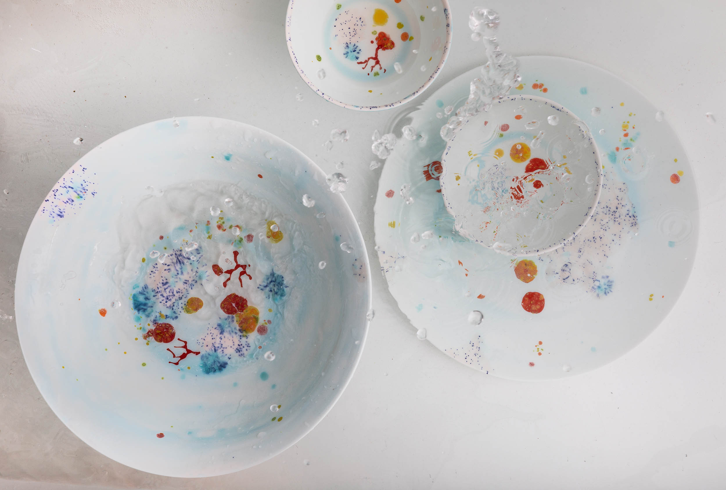 Light blue is the dominant color with corals lying on a bright shallow sea bottom surrounded by mysterious multicolored gems floating amid brushes of light pink sand sprinkled with black dots.