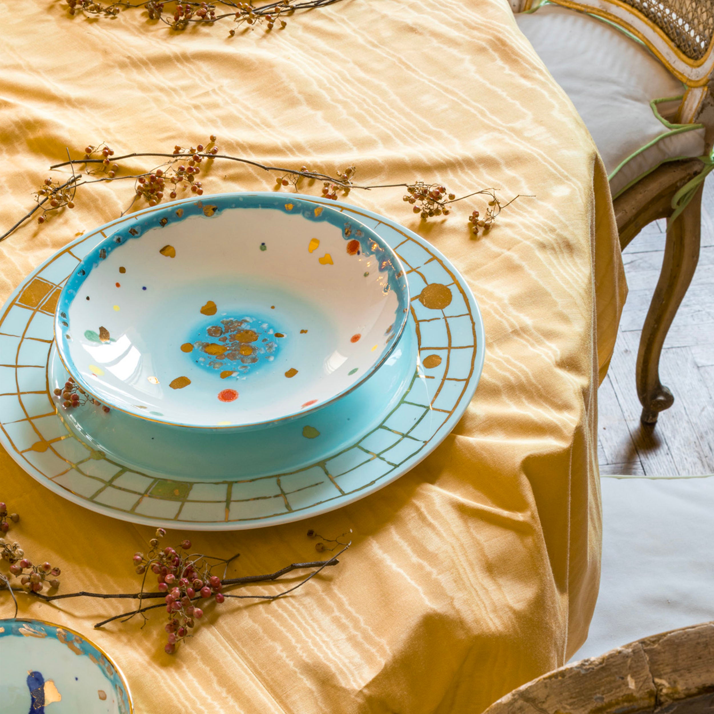Rosa Palm Beach, arancione Miami, verde Amelia, giallo Naples, turchese Crystal, lavanda Islamorada. Ogni piatto è decorato con un centro dai colori tenui, punteggiato da piccoli punti multicolore. Il bordo è riccamente ornato con foglie d'oro. I piatti da portata, le tazze da tè e da caffè sono decorati con una trama dorata. I piatti da dessert e le teiere presentano un design distintivo caratterizzato da raggi dorati che si incrociano sulla loro superficie.