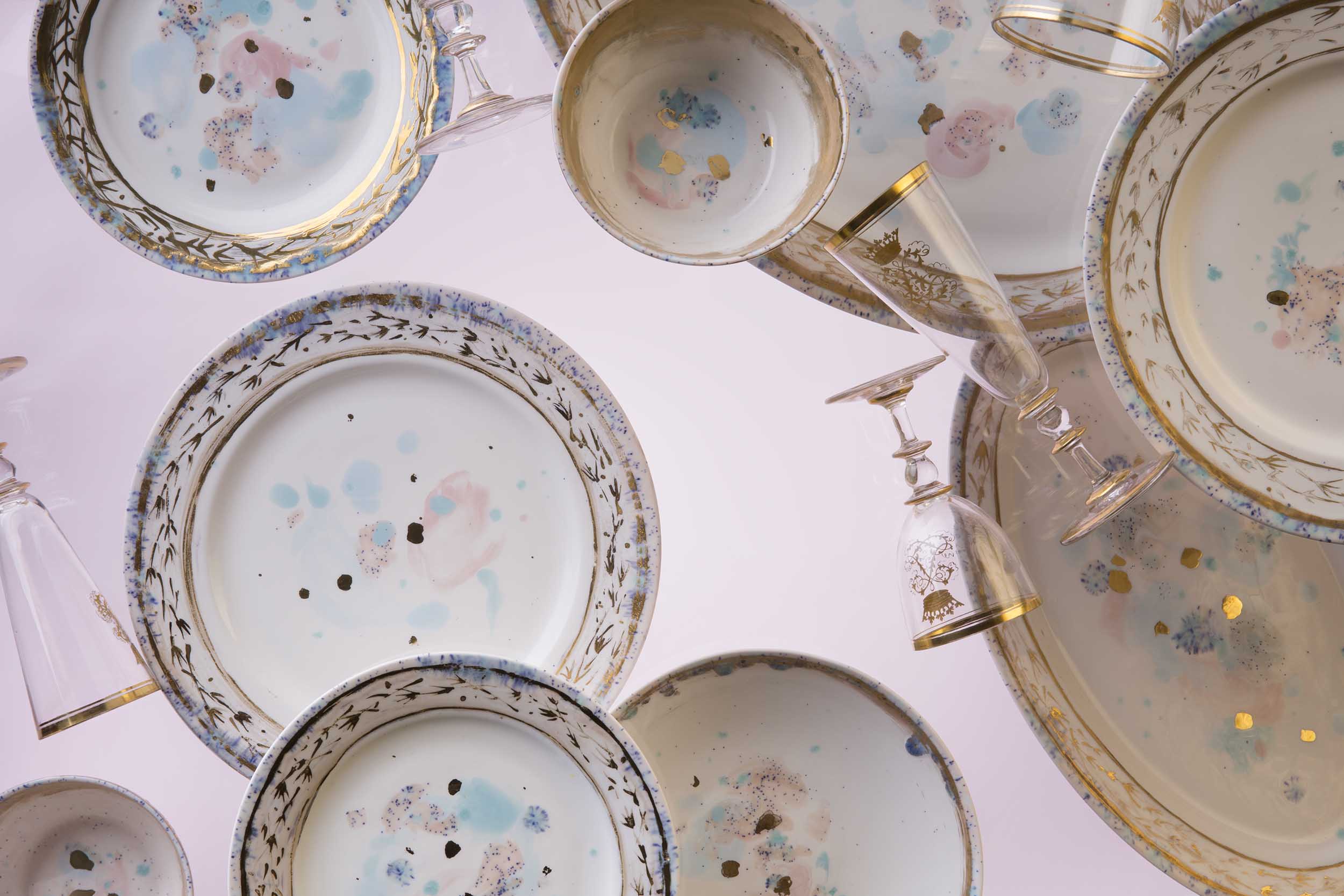 Borghese a Roma ed evoca la bellezza senza tempo dell’arte rinascimentale e barocca, esaltata dalle finiture dorate. Realizzati artigianalmente in Italia con la porcellana più pregiata, i piatti Dafne presentano un sottile bordo punteggiato di rosa e azzurro, che incornicia una raffinata decorazione dorata di fiori stilizzati. Il centro, bianco e luminoso, è arricchito da