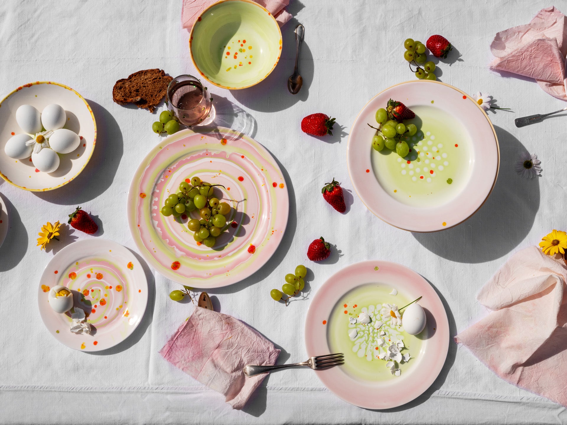 partendo dal centro trascinano nel loro vortice delle vivide macchie rosse, evocando i colori soffusi del cielo su cui si impone il sole nelle mattine primaverili. I piatti piani sono disponibili in alternativa con un motivo verde puntinato al centro, circondato da un delicato bordo rosa.